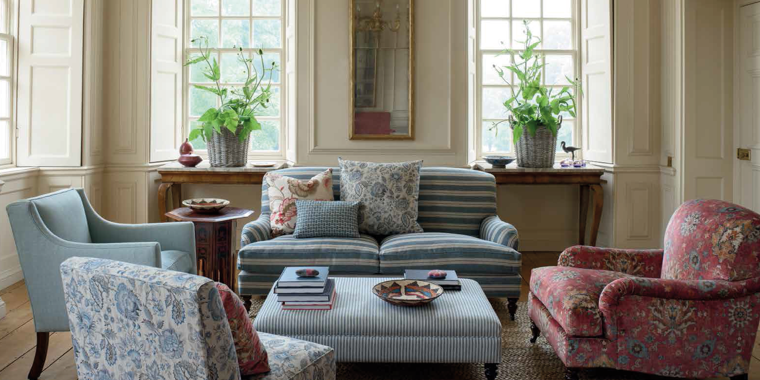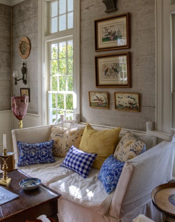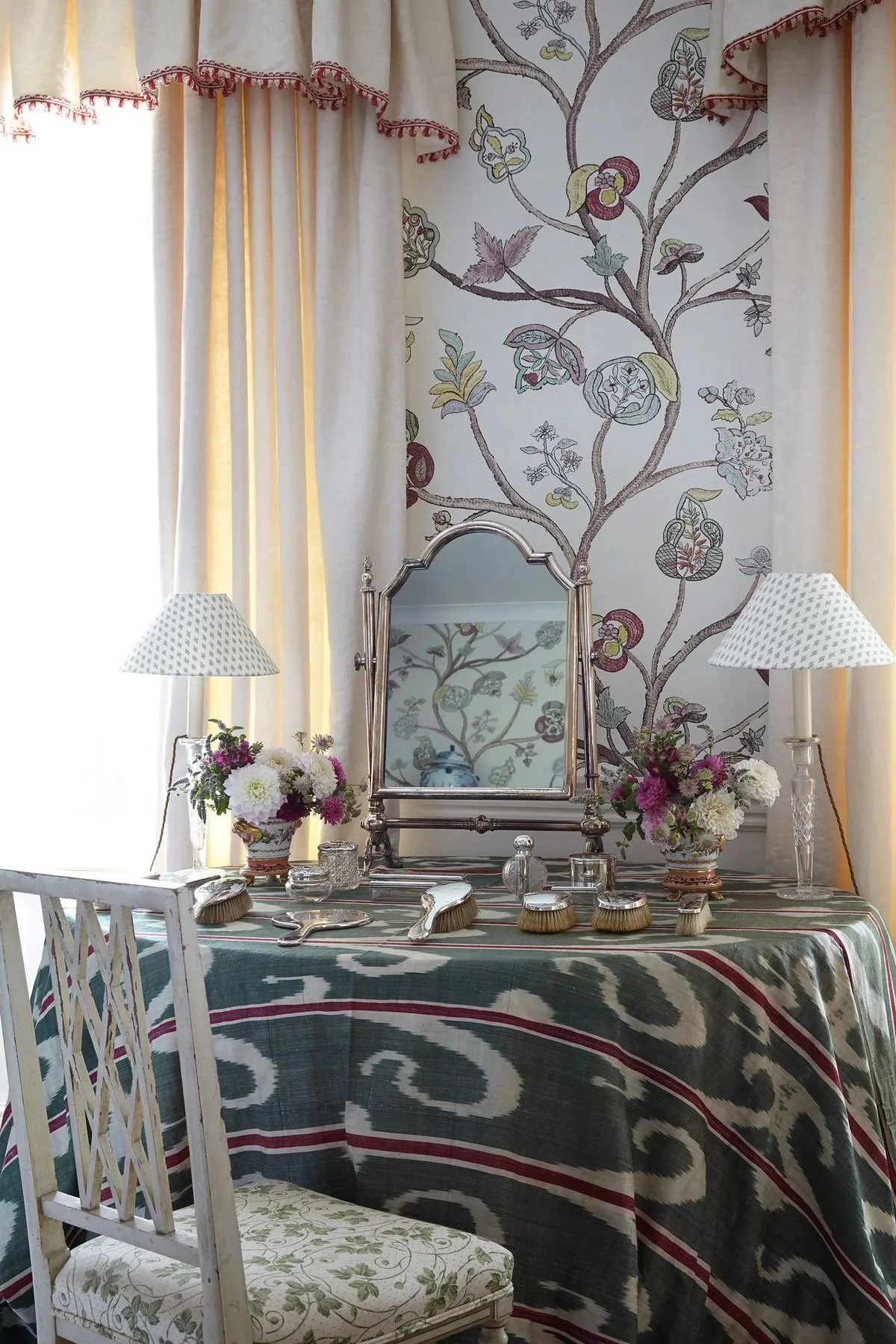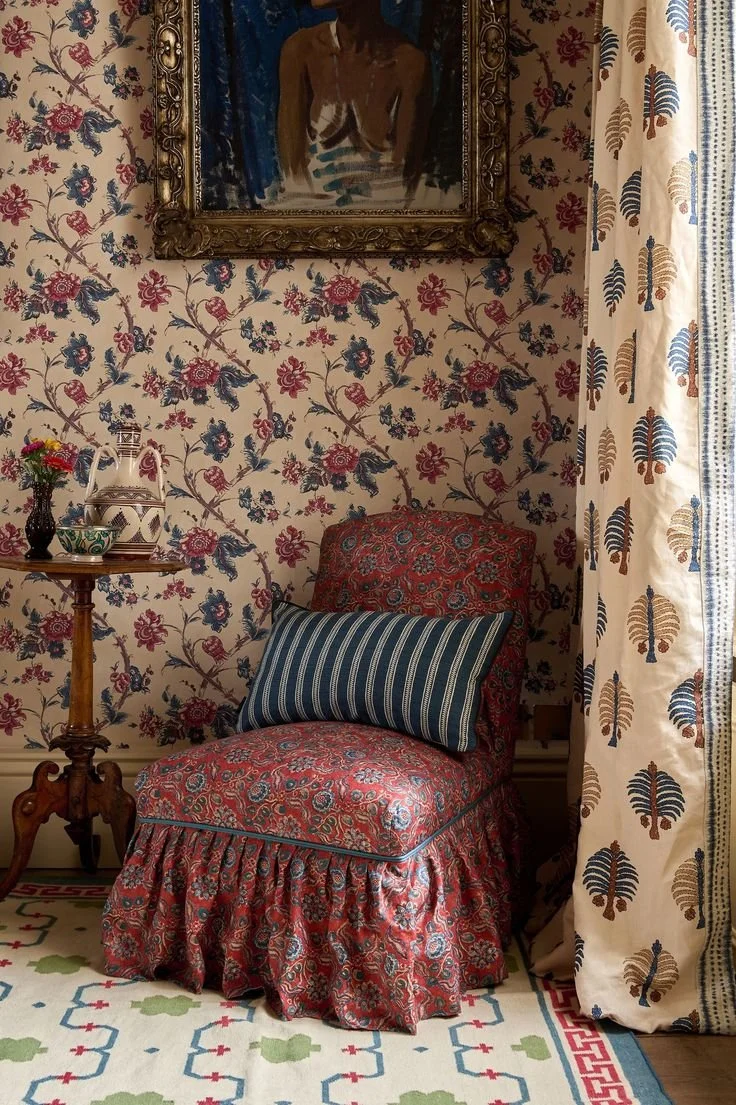 Small-scale prints act as "blenders" or “glue”, helping to bring together busier prints. For instance, you might find a small-scale print used as a lining of a curtain or on the backing of an upholstered chair. Some examples include: ditzy florals, soft stripes, tiny polka dots, and small geometric designs.