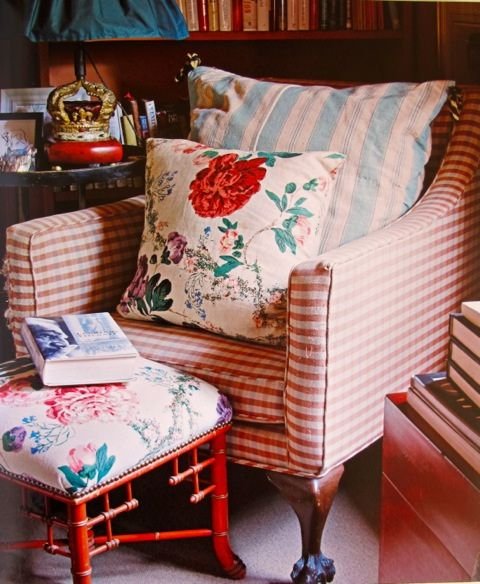 Successful pattern mixing relies on contrasts and commonalities. Contrasting scales (large, medium, small) and shapes (structured prints, like stripes, checks, geometric, paired with organic ones, like florals, paisleys, toile) creates harmony because they each play different roles and don’t fight with one another. Sharing a common color palette can further unify them.