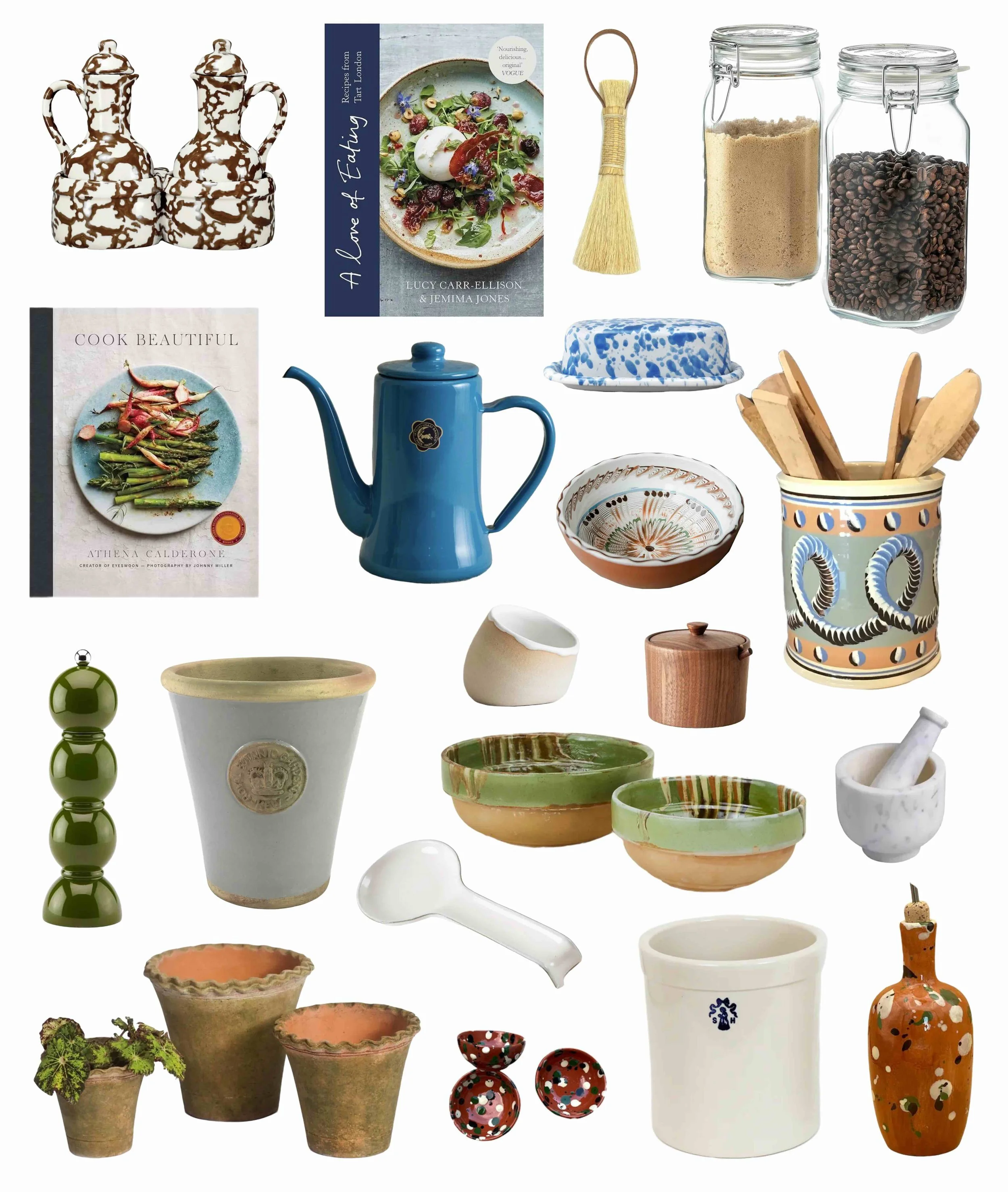 Spongeware olive oil & vinegar cruets. A Love of Eating cookbook - a new favorite cookbook. Broom. Glass jars. Cook Beautiful cookbook - an old favorite much used. Enamel kettle. Blue splatter butter dish - this is only $10! Hand-painted colorwell bowl. Mochaware crock. Bobbin grinder, khaki green. ‘Cotswold’ pot, light grey. Ceramic salt cellar. Walnut salt cellar. Marbleized green bowl. Marble mortar & pestle. Il Buco Vita spoon rest. Pie crust terracotta planter. Handpainted pinch pots. Stoneware crock. Olive oil cruet.