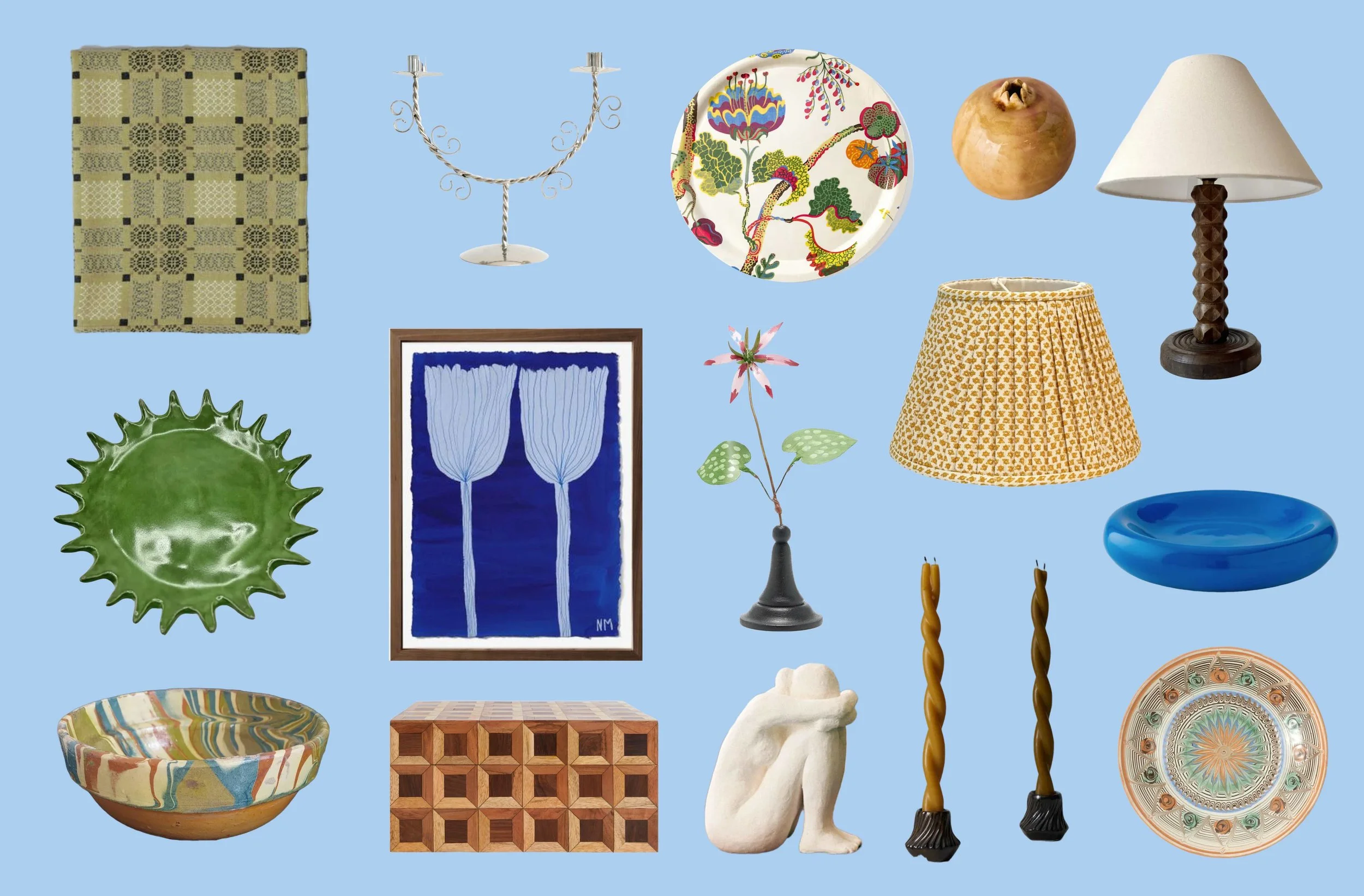 1. Seated woman sculpture. 2. Ceramic pomegranate. 3. ‘Magic’ box. 4. Casa Gusto tole beans. 5. Sunburst vide poche. 6. The green vase geranium. 7. Loewe candle. 8. Pietro box. 9. Metal violet sculpture. 10. Vintage frog censer. 11. Ginore x Luke Edward Hall vide poche. 12. Schoolhouse x Clare V catch all.